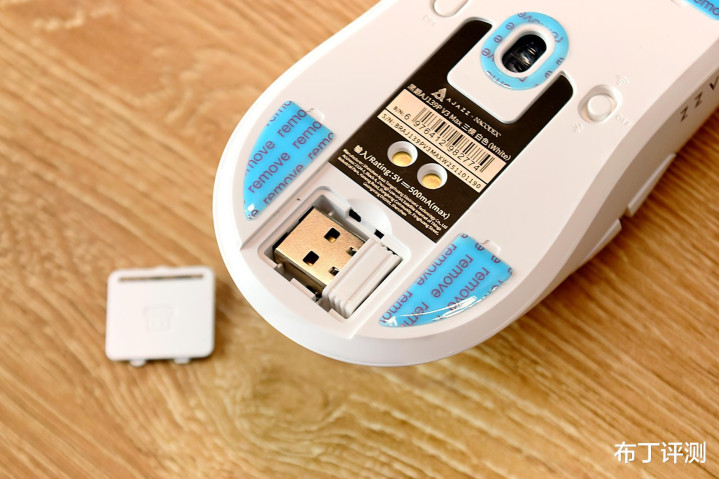 鼠标的底部还有个隐藏设计的收纳槽,内置2.4G接收器,另外在上面还有两个金属触点,可以搭配磁吸底座进行充电,使用起来更方便。