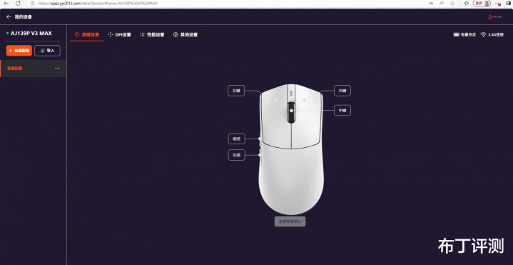 将鼠标通过有线或2.4G连接后,即可进入相应的网页驱动界面,分为按键设置、DPI设置、性能设置和其他设置共4个功能界面,分类详细、标识清晰,更加方便用户根据需要快速对鼠标进行各种设置。
