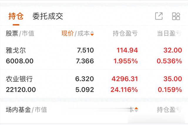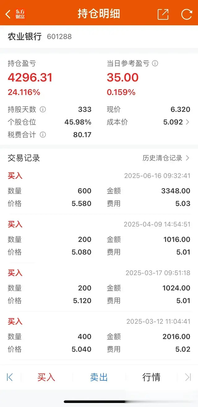 自 2024 年 8 月,农业银行股价在 4.6 元左右时,我开启了对它的投资。每月发工资后,我都会拿出一部分资金买入一手或两手,持续加仓至今,已经持有 3500 股。期间收获了一次中期分红,马上 7 月 16 号又将迎来第二次分红,我计划把这两次分红都用于复投。目前,账户收益达到了 24.1%,这一路走来,让我对银行股投资有了不少感悟。